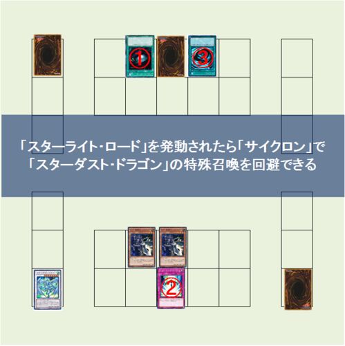 前回《スターライト・ロード》から特殊召喚された《スターダスト・ドラゴン》は《奈落の落とし穴》で除外されるんだっけ?って話したときに《スターダスト・ドラゴン》の特殊召喚は《サイクロン》で回避できると書いた。 《スターライト・ロード》に《奈落の…